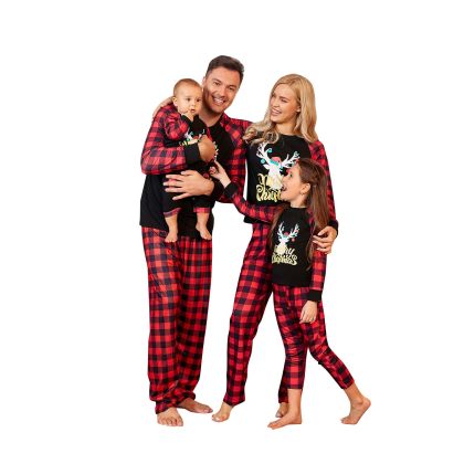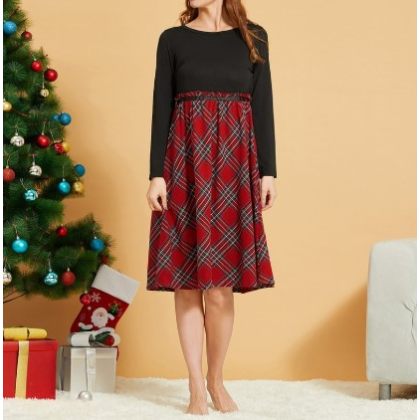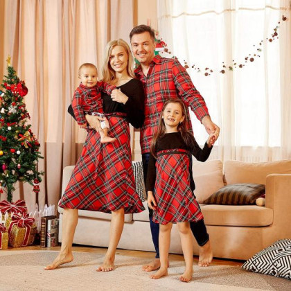 Red Plaid Shirt And Long-sleeved Patchwork Dress Family Outfits