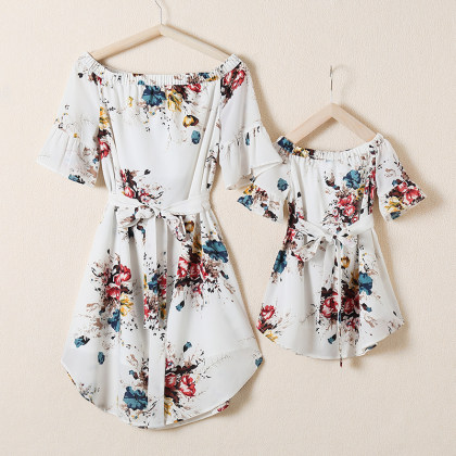 Off The Shoulder White Floral Chiffon Mom Girl Matching Dress