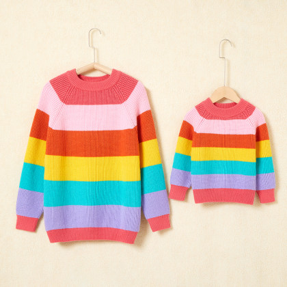 Sissifun Round Neck Long Sleeve Color Striped Mom Girl Matching Sweater