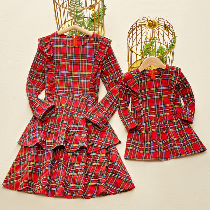 Sissifun Long Sleeve Red Plaid Ruffled Mom girl Matching Dress - 1305