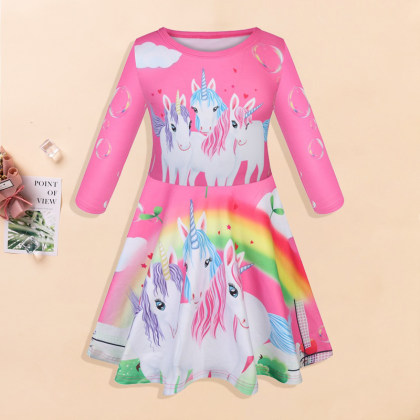 【3Y-11Y】Girl Sweet Unicorn Pattern Round Neck Long Sleeve Dress