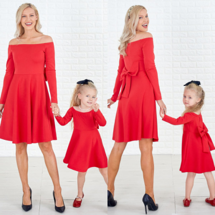Sissifun Sweet Off The Shoulder Back Bow Red Mom Girl Matching Dress