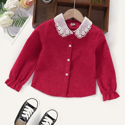 【18M-7Y】Girl Sweet Red Corduroy Lace Lapel Long Sleeve Shirt