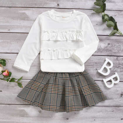 【18M-7Y】Girls Lace Long-sleeved Sweatshirt Plaid Pleated Skirt Set